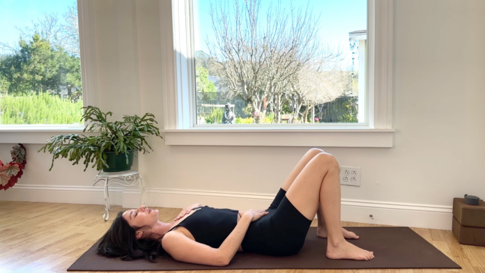 Yoga teacher Michelle Martone in reclined Cow Pose, part of her routine of core strengthening exercises